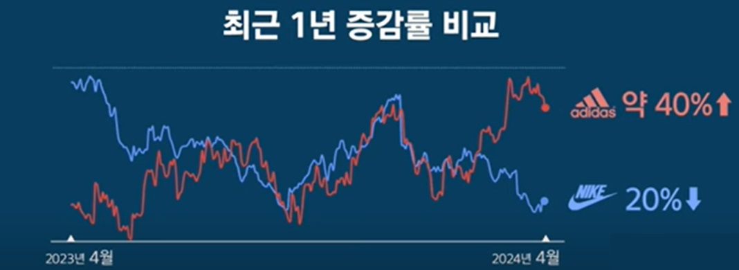 최근 1년 주가를 보았을 때, 아디다스는 악재 속에도 저점 대비 약 40% 상승했으나, 나이키는 고점에서 20%정도 떨어졌습니다. 2021년 역대 최고점보다도 거의 50%가 빠졌습니다. 나이키가 갑자기 늙었다는 시장의 평가와 관련이 있는 상황이며, 블룸버그 통신은 에어포스1 같은 예전 모델에 대한 나이키의 의존도가 있다고도 평가했습니다.